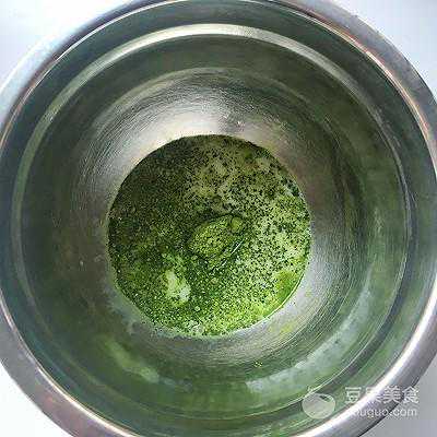 15、再来做抹茶卡仕达酱,干净的容器内加入抹茶粉,先加入30克左右的牛奶,将抹茶粉搅拌均匀
