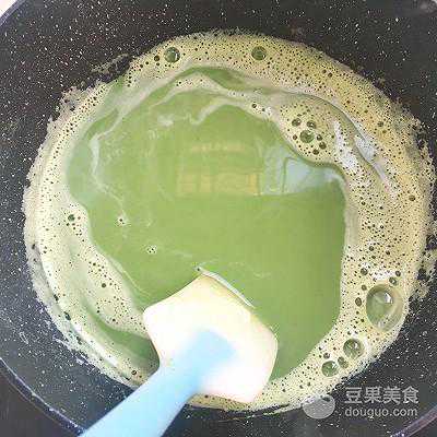 22、边加热边搅拌,将抹茶卡仕达酱熬至浓稠状,之后关火继续搅拌
