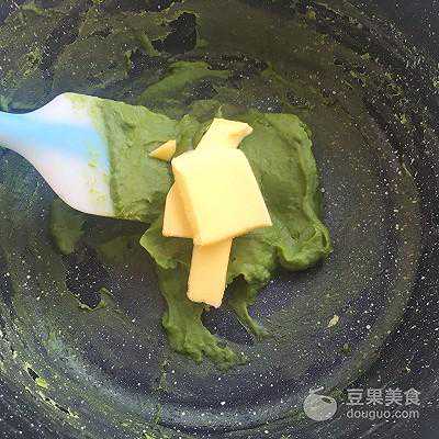23、加入黄油,用抹茶卡仕达酱的余温融化黄油,并搅拌均匀