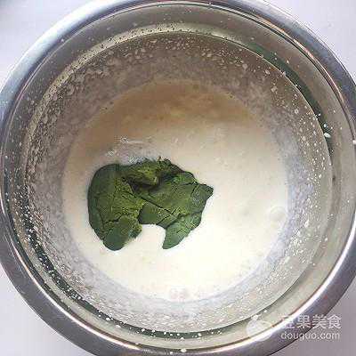 1、先来做毛巾卷面糊,干净的容器内加入抹茶粉,加入40克左右的牛奶,用蛋抽将抹茶搅拌均匀