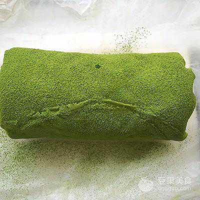 33、之后从铺的第一张面皮开始卷起,将抹茶卷卷起来