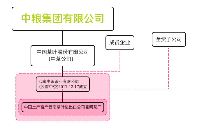 中茶公司成立于1949年,是世界500强之一中粮集团有限公司(COFCO)成员企业,是新中国成立后首家由中央批准成立的全国性专业总公司。作为四大主要普洱茶工厂之一,中茶集团,也叫中国土产畜产进出口公司(CNNP),经历了一系列重大变革。