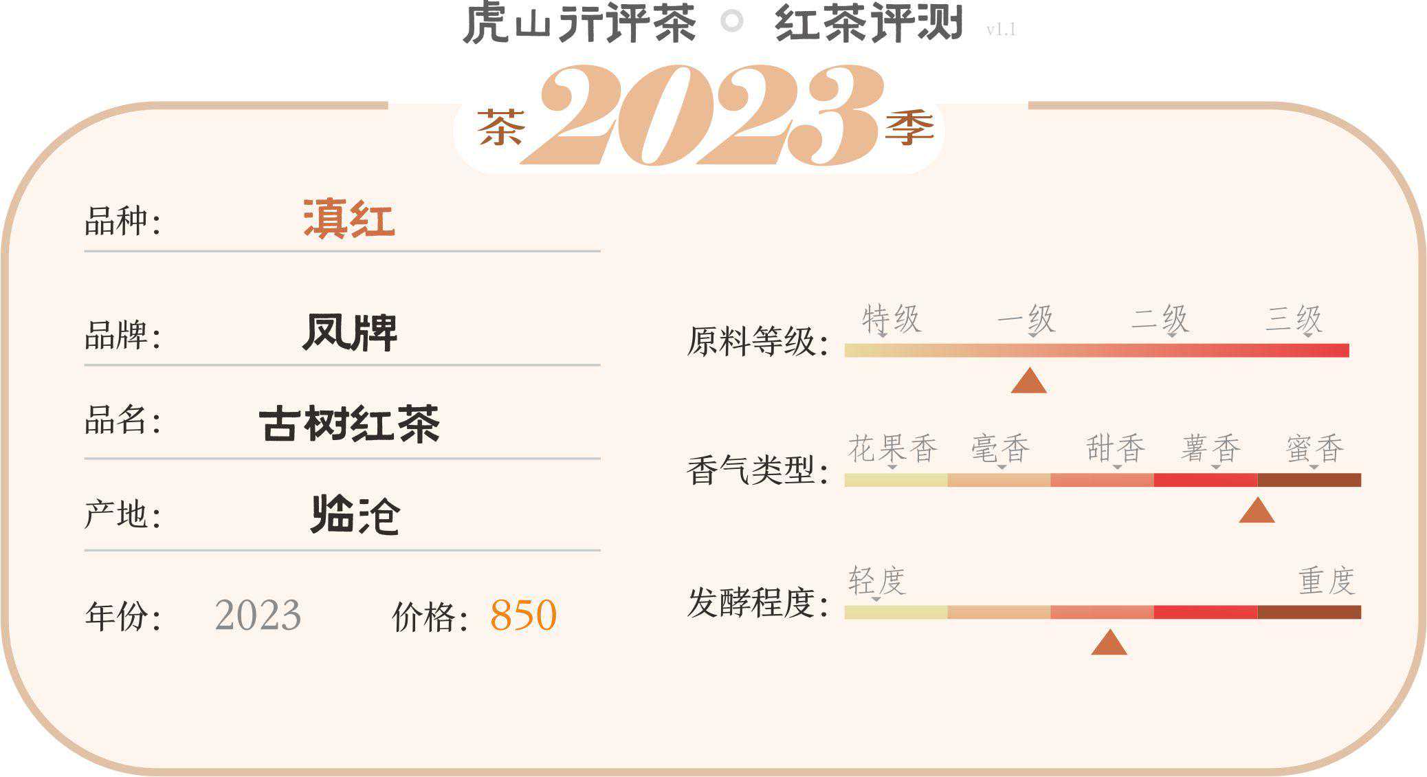 综合评价通过评测,我们可以看到这款凤牌古树红茶口感还是不错的,香气发挥较好,汤感协调,厚度甜感也有可取之处,各方面表现都较平衡。