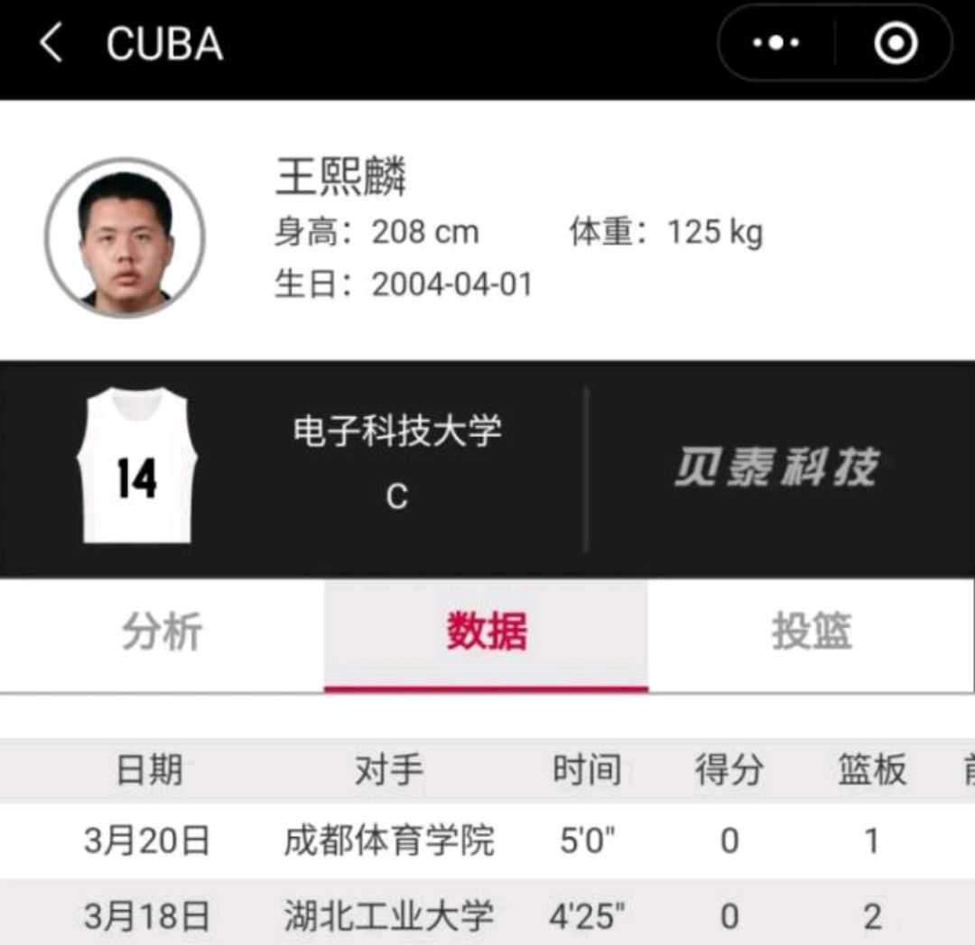 而曾几何时,很多球迷将希望寄托于他的儿子王熙麟身上,如今王熙麟已经21岁,去年他进入了CUBA的赛场,并且代表成都电子科技大学出场,只不过2.08米的他并没有打出亮眼表现,接连两场比赛贡献0分,最终也是被主教练弃用,如今更是没能进入大名单,这样的情况下基本上可以宣告王熙麟无法进入CBA赛场。究其原因他的体重是最大的问题,目前他的体重达到了250斤,虽然具备了体重优势,但是行动缓慢,也没有王治郅的投篮手感,内线脚步更是粗糙至极……