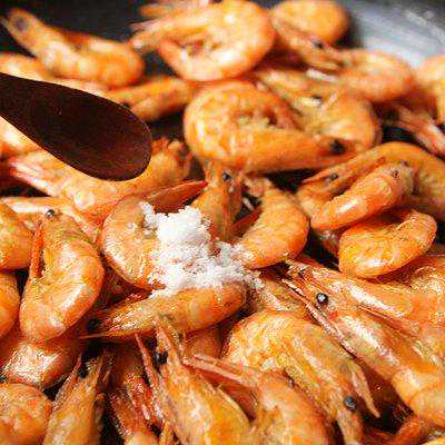 7、把锅内的油倒出,然后把虾倒入锅内,放入盐翻炒均匀;,