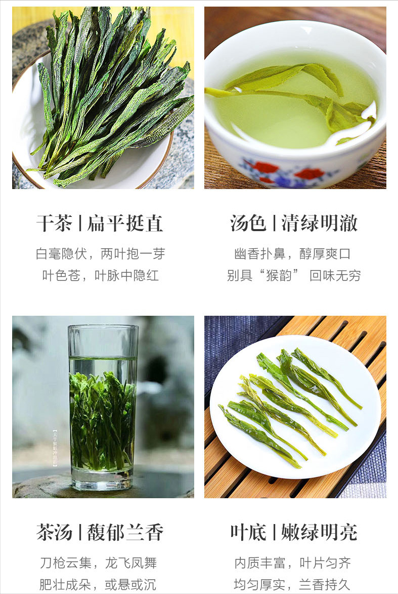外形两叶抱芽,扁平挺直,自然舒展,全身披白毫,含而不露,叶色苍绿匀润,叶脉绿中隐红;兰香高爽,滋味醇厚回甘,汤色清绿明澈,叶底嫩绿匀亮,芽叶成朵肥壮。
