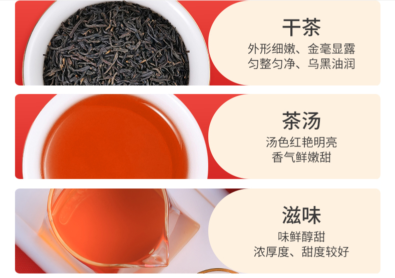 茶叶香气清香持久,似果香又似兰花香,国际茶市上把这种香气专门叫做"祁门香";汤色红艳透明,叶底鲜红明亮。滋味醇厚,回味隽永。