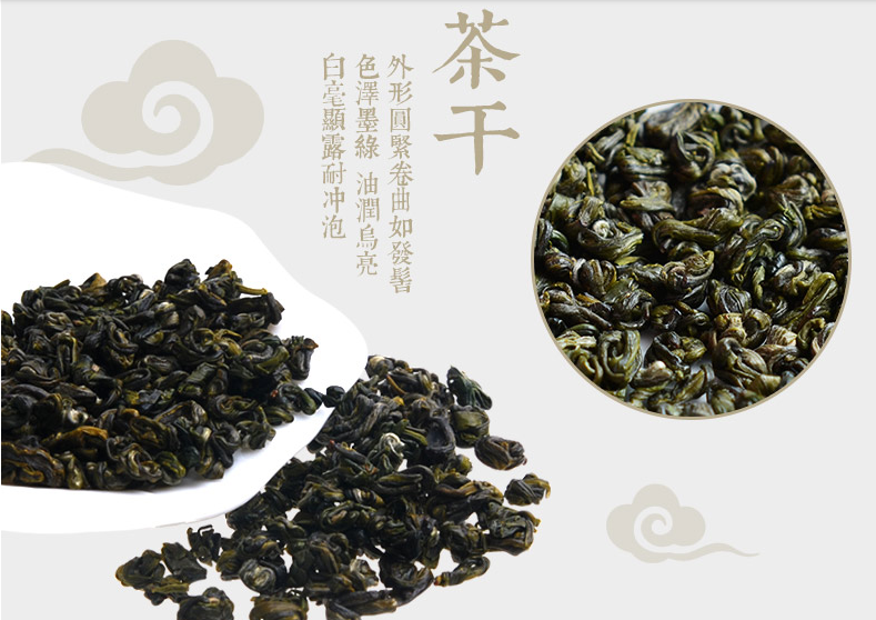 匀齐成朵、形似雀舌、嫩绿披毫,香气清香持久,滋味鲜醇浓厚回甘,汤色黄绿清澈明亮,叶底嫩黄明亮。