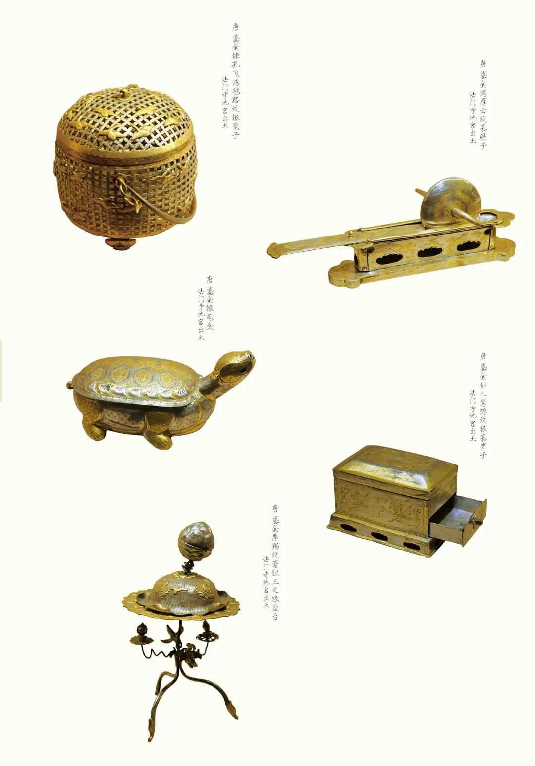 这样的饮茶方式催生出的茶器自成体系。《茶经》中陆羽精心设计了适于烹茶、品饮的二十四器。其中,具有代表性的茶器有茶釜、茶瓯、茶碾和执壶。与此同时,生产茶具的窑口遍布全国,最具代表性的南方越窑与北方邢窑,在当时形成“南青北白”的局面。此外长沙窑、婺州窑、寿州窑、洪州窑、岳州窑等也出产茶具。近年出土的长沙窑“茶”字碗和西安王明哲墓的器底墨书“老▢家茶社瓶”执壶,就是唐代典型的茶具。另外,1987年陕西省扶风县法门寺地宫出土了一套唐代宫廷茶具,这套银鎏金的奢华品让今人亲见唐代宫廷煮茶的样貌。