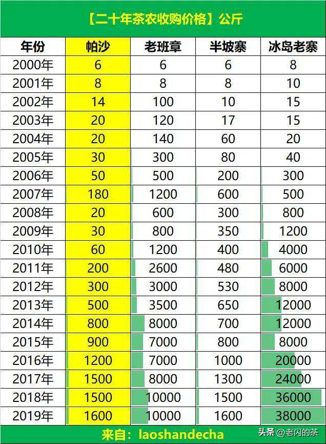 接着,我们说一下帕沙这些年的价格,我拿了离得比较近的老班章和半坡寨,还有也是香甜感较强的冰岛老寨做一个比较。