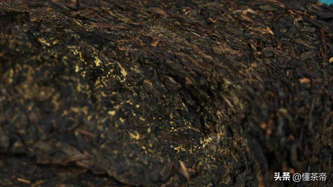 六堡茶的“金花”,金黄圆润,叶片上、缝隙上、茶梗四周均有着生。