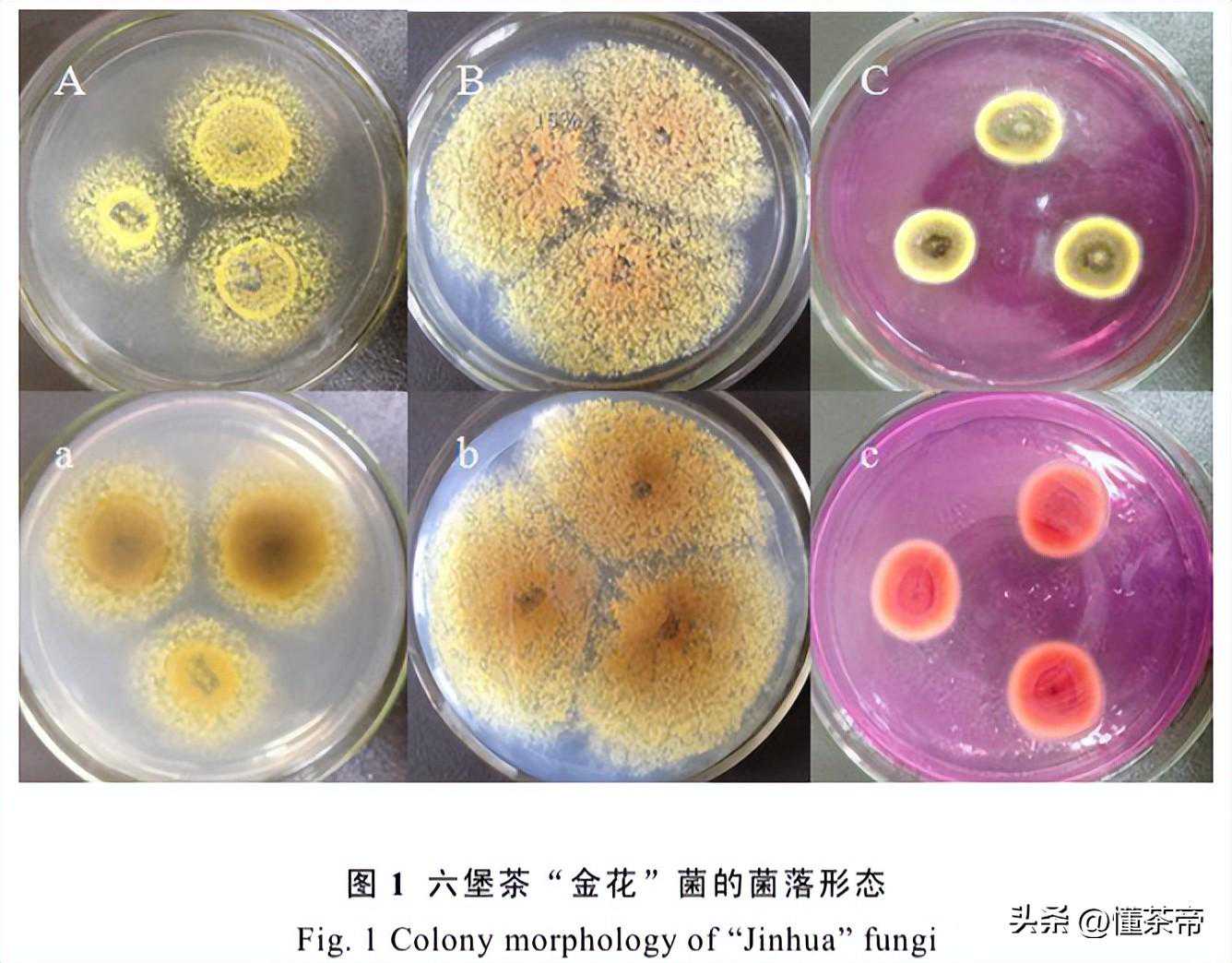 其次,二者菌种不同。研究者通过分离金花菌的菌种后发现,茯砖茶的金花是冠突散囊菌,而六堡茶的金花是雪黄散囊菌;