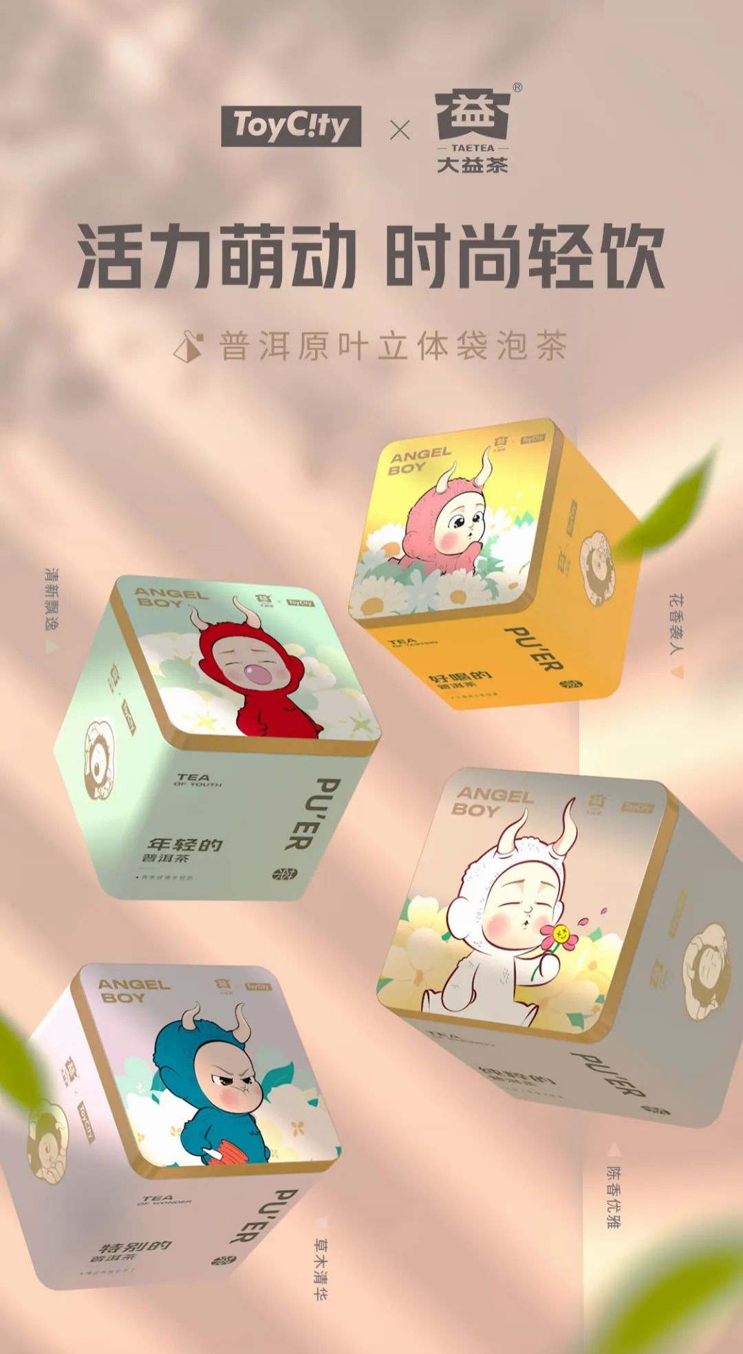 今年6月,大益茶与原创萌宠IP“奈娃家族”合作,推出联名产品「小罐袋泡茶系列」;10月,又与潮玩品牌Toycity联手,推出「ANGELBOY系列袋泡茶」,均是专门针对年轻群体打造,健康轻饮、创意十足!