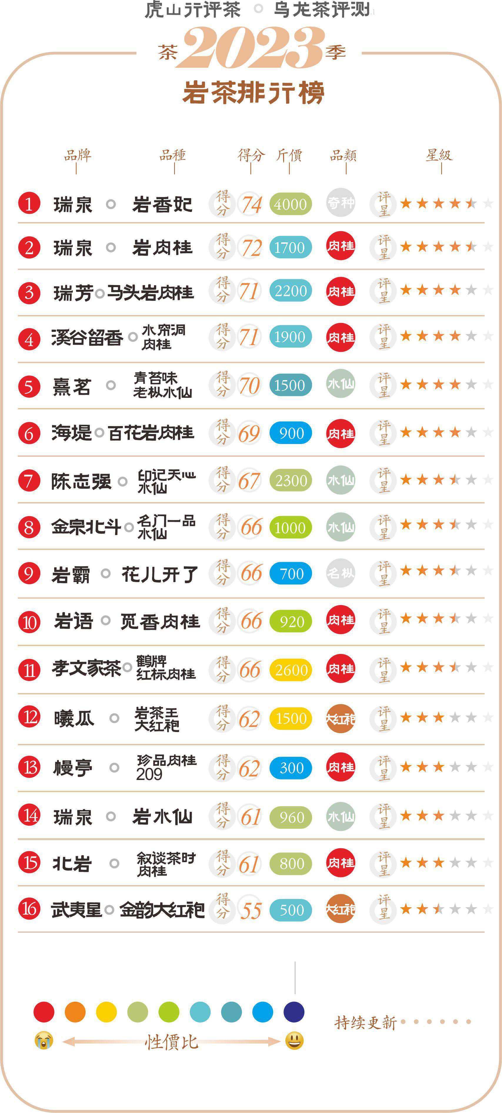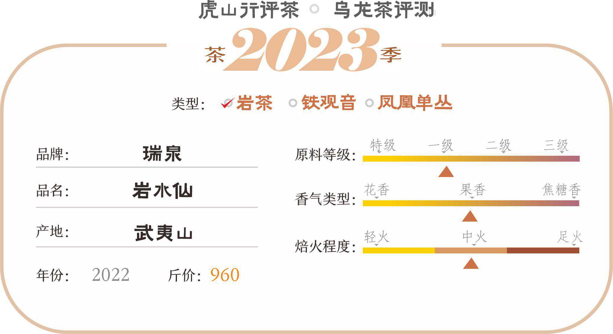 综合评价通过评测我们可以看到这款瑞泉的岩水仙表现相对瑞泉这个系列的岩肉桂要弱了不少,整体口感有水仙的醇厚特征,香气较为丰富,有一定层次感,火功也不过。汤感较醇厚,内质释放持续,滋味也较均衡、工艺适度,有喉韵表现,滋味留存时间也不低。