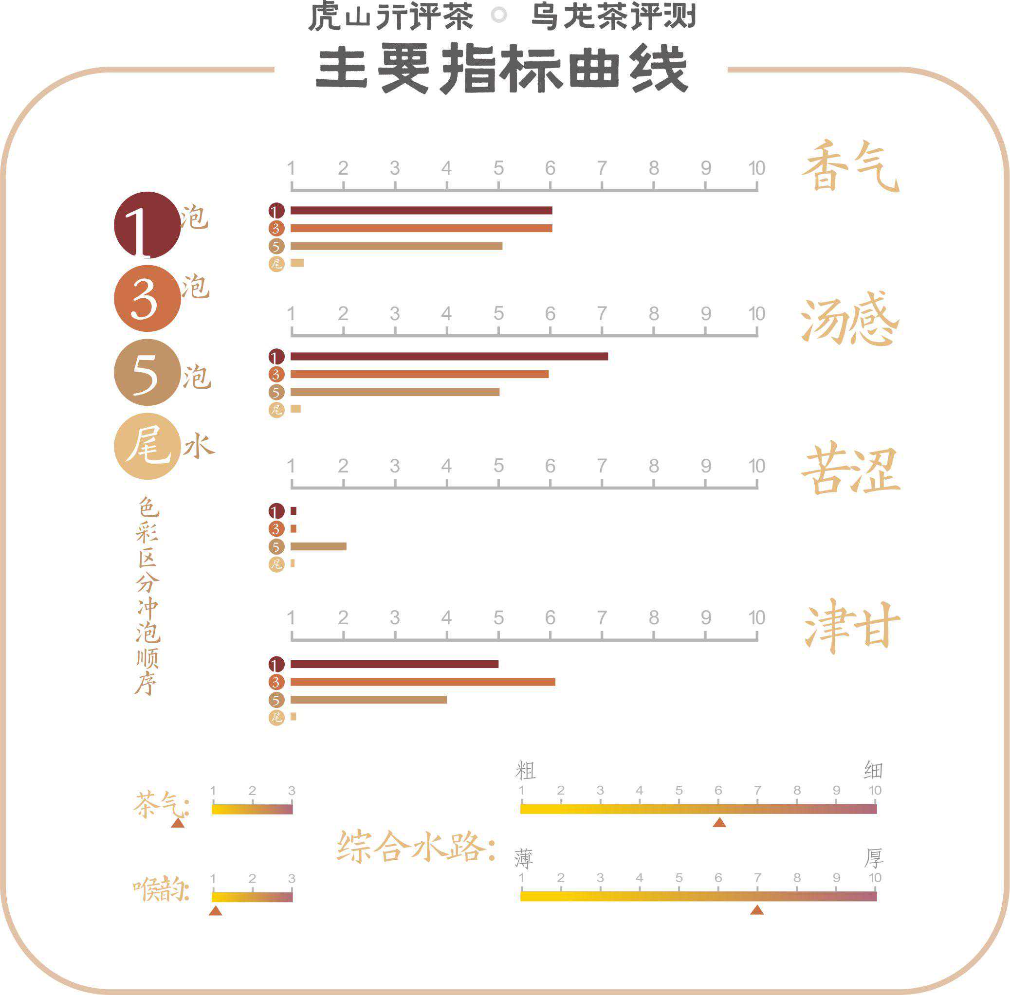 评测指标走势指标解析:通过评测图示可见此茶香气浓郁不算突出,但有较好延续性,尾水香气不减太多,六泡仍有余香;汤感表现较稳定,醇厚且较甘爽,有一定回味时间;苦涩感也还不错,只有尾水涩稍显;生津回甘表现不弱,喉韵有一定强度及持续性;水路上质厚有,细腻不显。