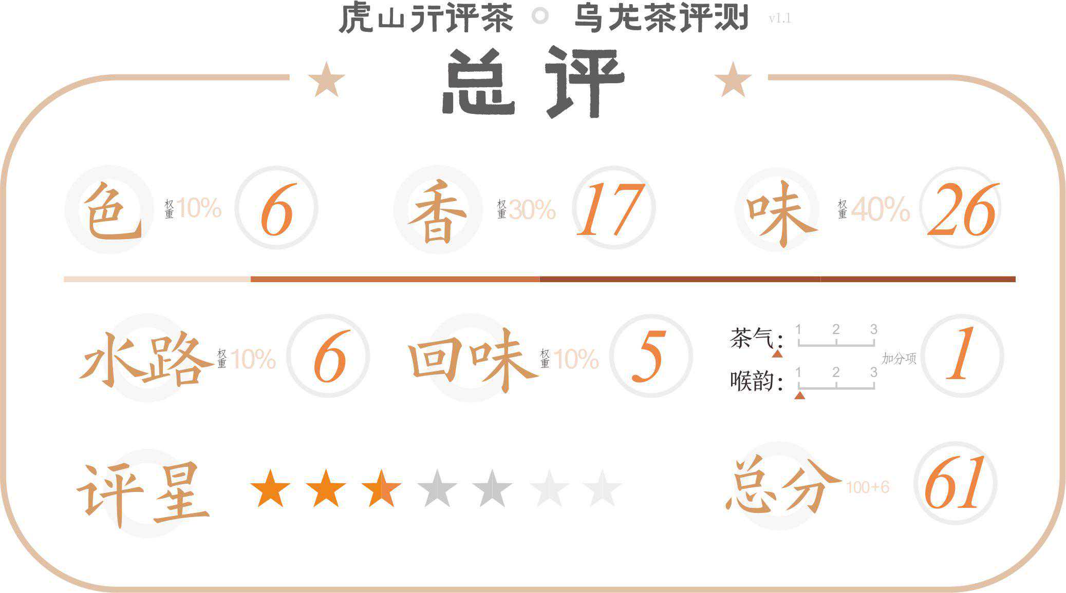 以活、甘、清、香为标准,活为中、甘为中、清为中下、香为中下。最终得分为61分,结合目前并不低的实际售价,性价比很一般化。