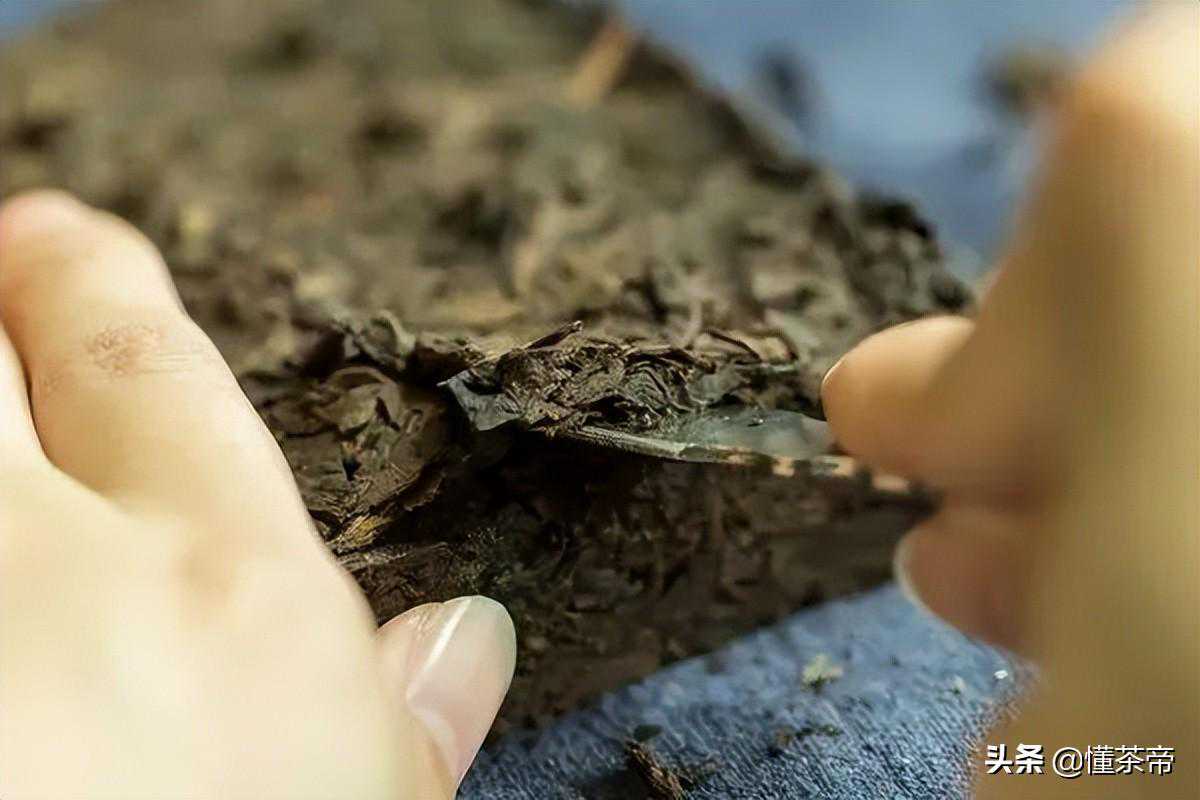 压制得比较松的茶砖侧面会有缝隙,我们可以将茶刀顺着茶砖缝隙插入,然后将茶慢慢剥离。
