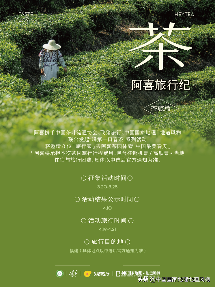 以这样的初衷,中国国家地理·地道风物联合喜茶、中国茶叶流通协会、飞猪旅行,在这个春天联合发起“喝第一口春茶”最美春茶园喜悦茶生活征集活动。希望结合喜茶及新茶饮这种年轻群体更喜欢的茶文化表达方式,邀请大家拿着我们制作的这张“中国最美茶园春游地图”,去各地茶园感受中国最美的春天,用更年轻的方式展示中国茶的魅力。
