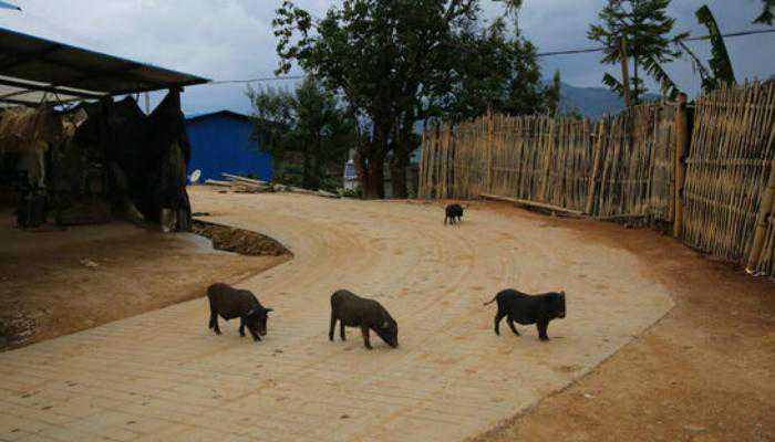 一路上随处可见野放的小黑猪、猫狗等动物,在村里大摇大摆的踱着步。