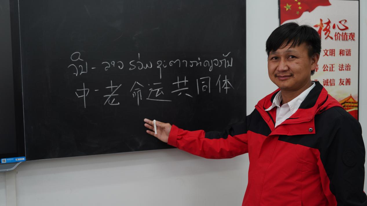 宋沙力在黑板上用中老双语写下“中老命运共同体”。海外网杨皓铭/摄