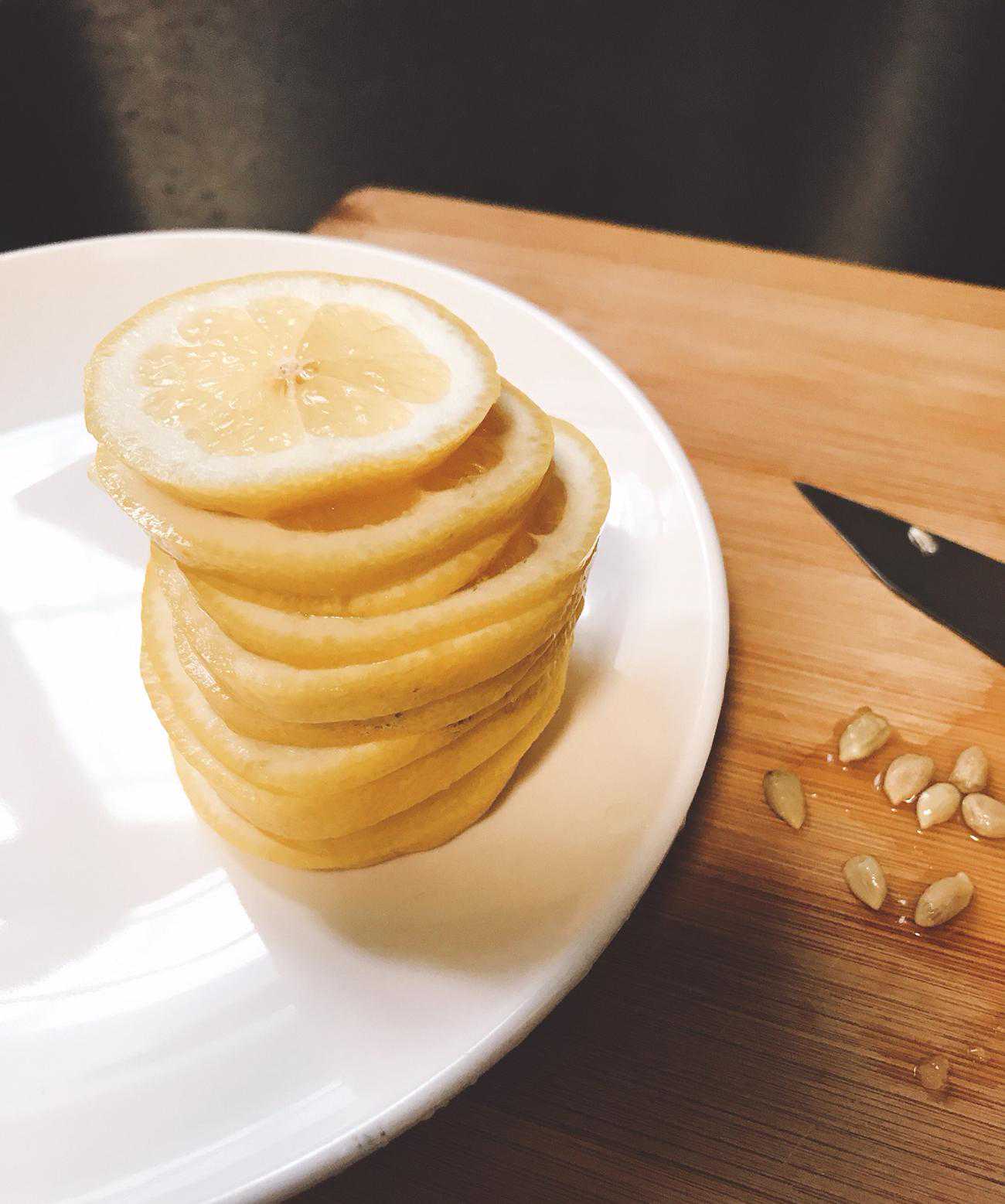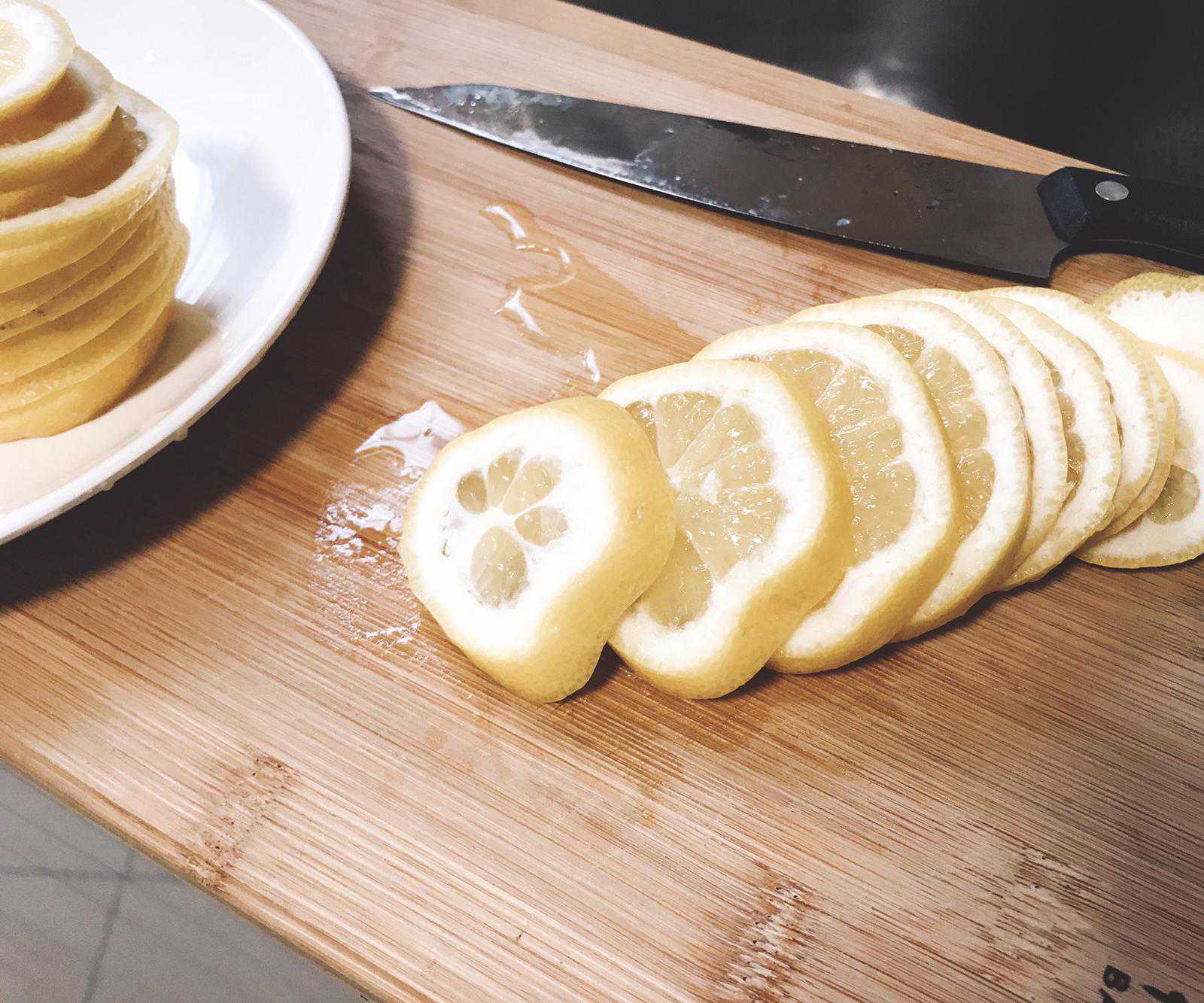 3.柠檬切片不要切太厚,也不要切太薄,2厘米适中就可以了。