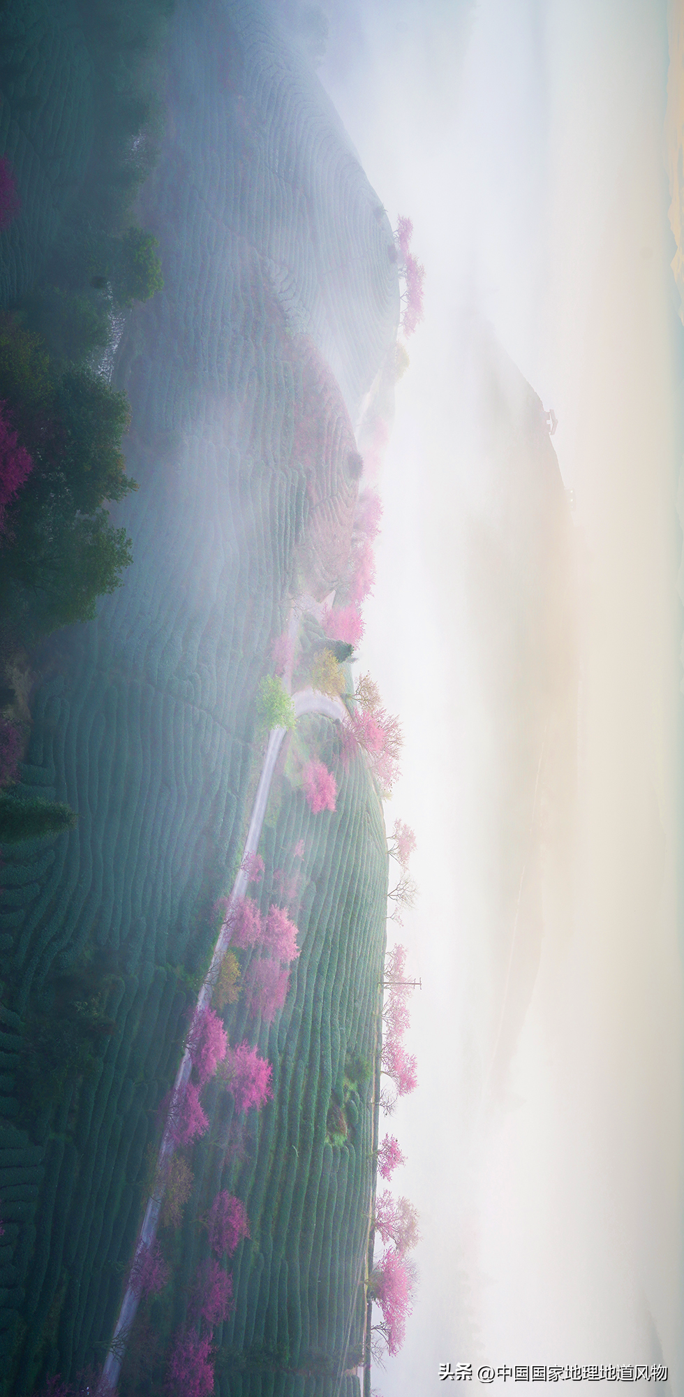 当山、水、云、雾、茶、花等自然元素集合在一幅画框之中,就构成了东方美学中或壮丽或婉约的图景,而中国最美的春天也就定格在这里了。