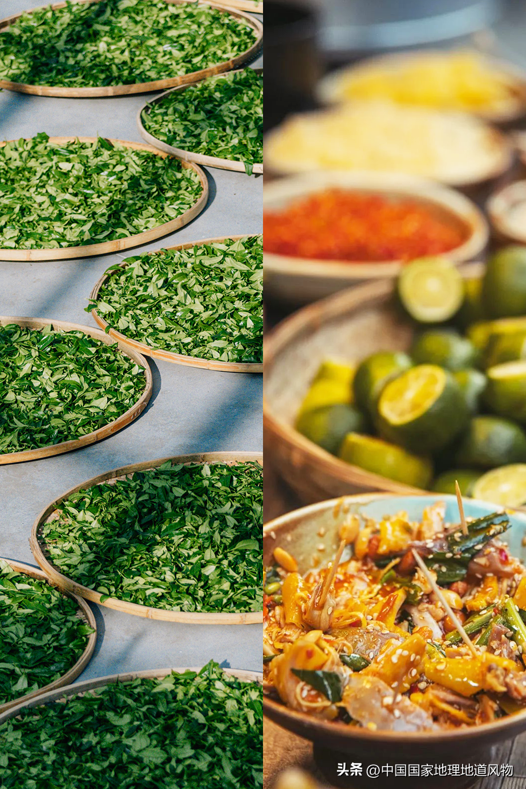 在这片茶与森林混生之地,茶叶的山野气息也极其馥郁,景迈的普洱茶虽有微微涩感,但醇厚、甘甜且持久,小小的茶叶还在景迈山的全茶宴上展现着百般姿态,滑嫩清香的古树茶炒鸡蛋、爽辣刺激的凉拌茶叶尖,油炸煸香的干煸古树叶..早春的滋味都被浓缩在舌尖。