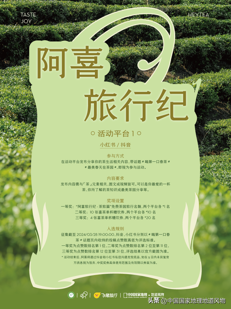 以这样的初衷,中国国家地理·地道风物联合喜茶、中国茶叶流通协会、飞猪旅行,在这个春天联合发起“喝第一口春茶”最美春茶园喜悦茶生活征集活动。希望结合喜茶及新茶饮这种年轻群体更喜欢的茶文化表达方式,邀请大家拿着我们制作的这张“中国最美茶园春游地图”,去各地茶园感受中国最美的春天,用更年轻的方式展示中国茶的魅力。