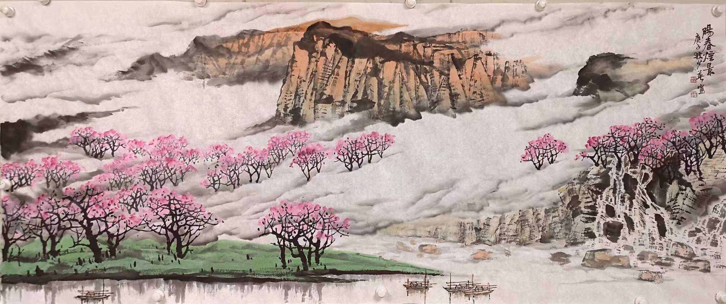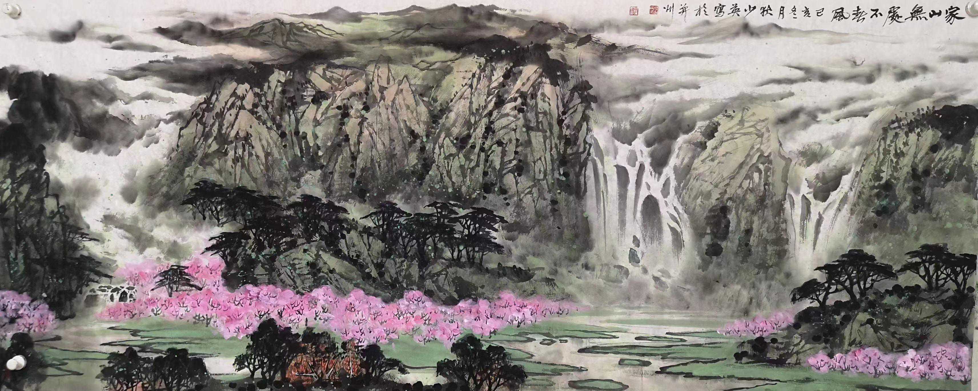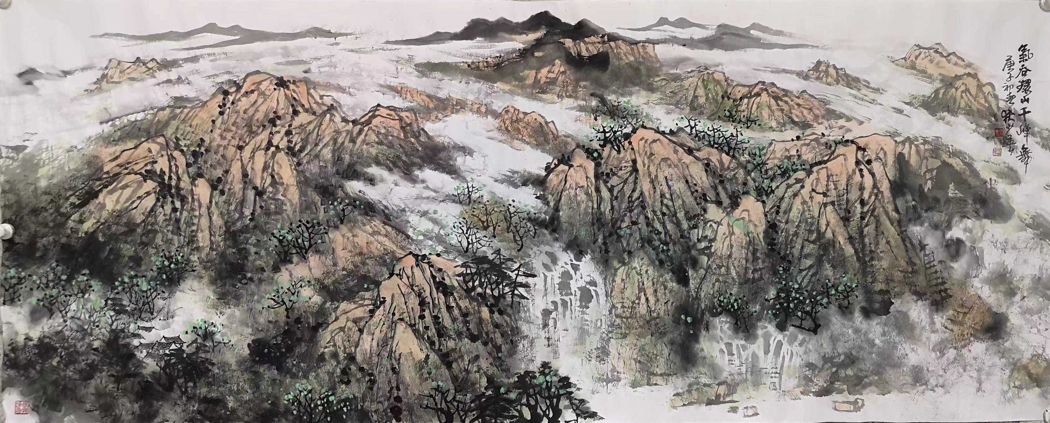 观“狄家山水”有别具一格的新意之感!这种新,不是用西画改良中国画的新意,也不是在技法上“喷水”“喷墨”困兽犹斗般无奈涂鸦的所谓新意,而是将感性线条和多姿斑斓的色彩,通过笔墨融通文脉之中,汇聚山水灵气呈现在丹青之上的新意与遐思。《太行雄姿》《吕凉山色》《板山之春》《物华金山》《阳春烟景》中便有此境界。