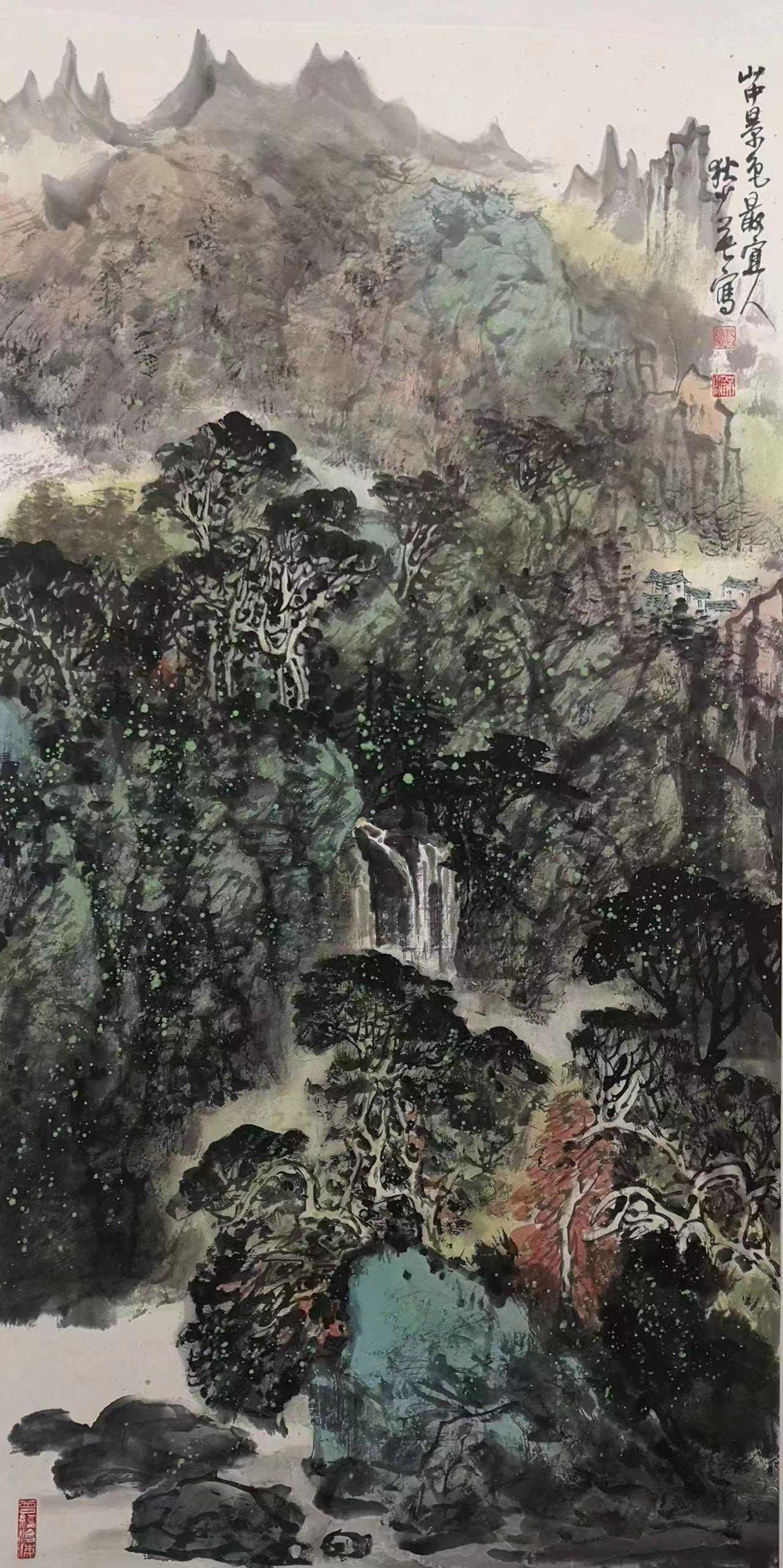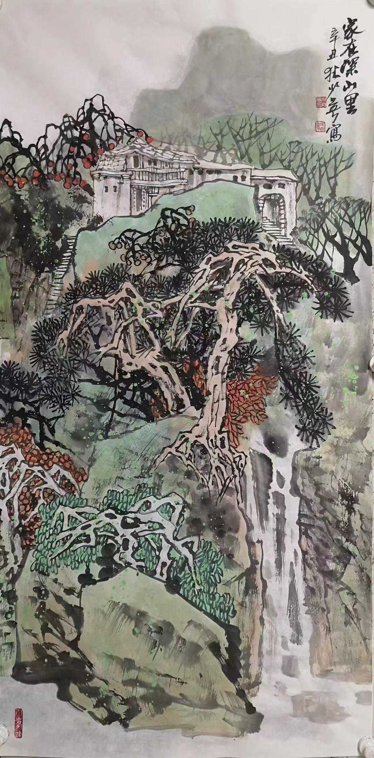 从狄少英先生的山水代表作《家在山水间》《山里人家》《云起山更幽》《阳春烟景》中,可以看到笔墨线条流畅和力透纸背相互结合,将人工化的自然与自然造化的本然综合表达,将至情至性传达到观赏运用得恰到好处,又有近处一树一石的远近现实。似乎观者可以拾级而上“作画中人”了!客观与主观,远观与近赏在同频共振中,传递“狄家山水”之“气”充盈且绵长的生命力。