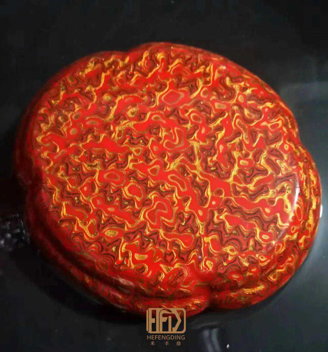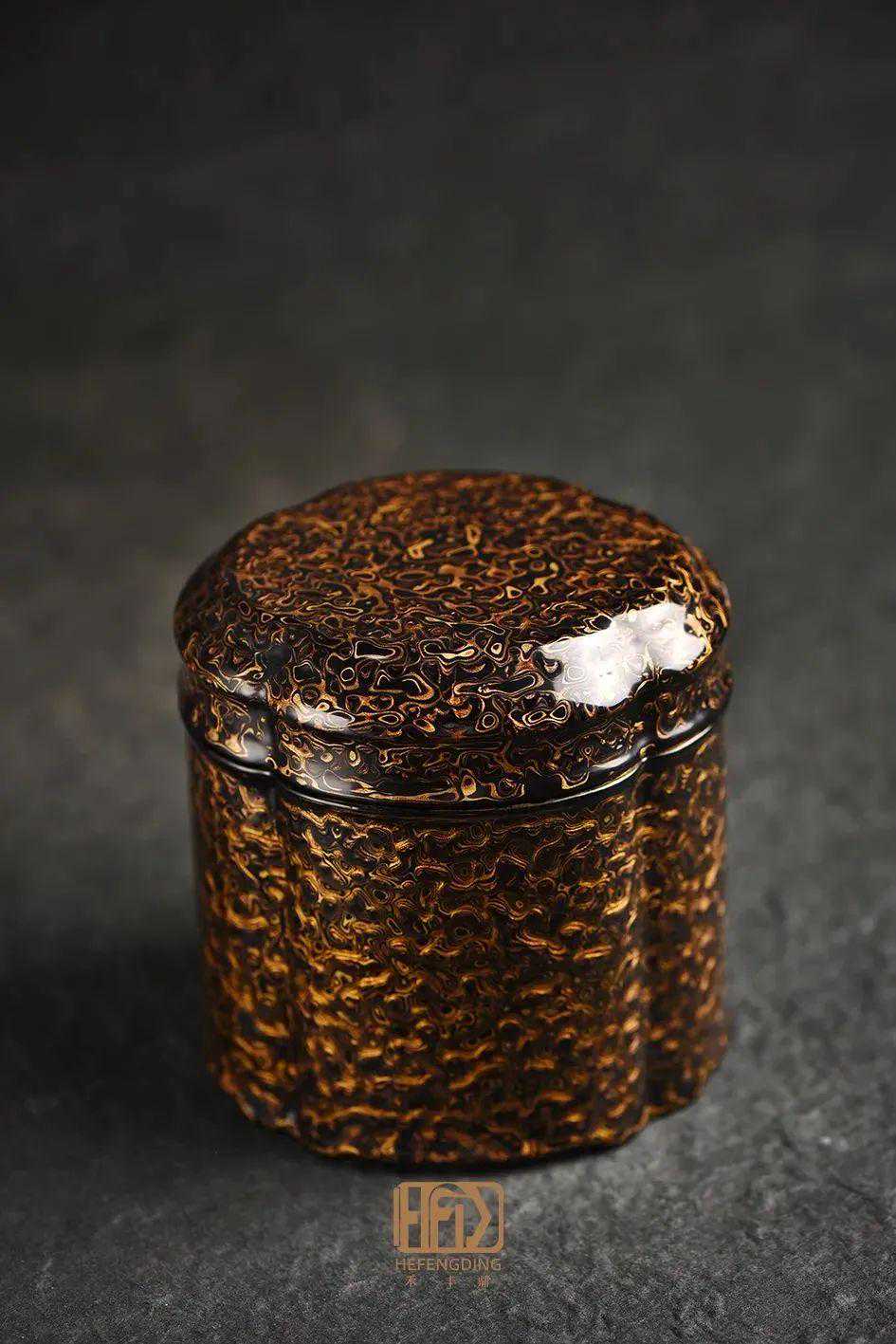 红金斑茶叶罐,罐身和盖全都饰犀皮漆,流畅的纹理像盛开的海棠。