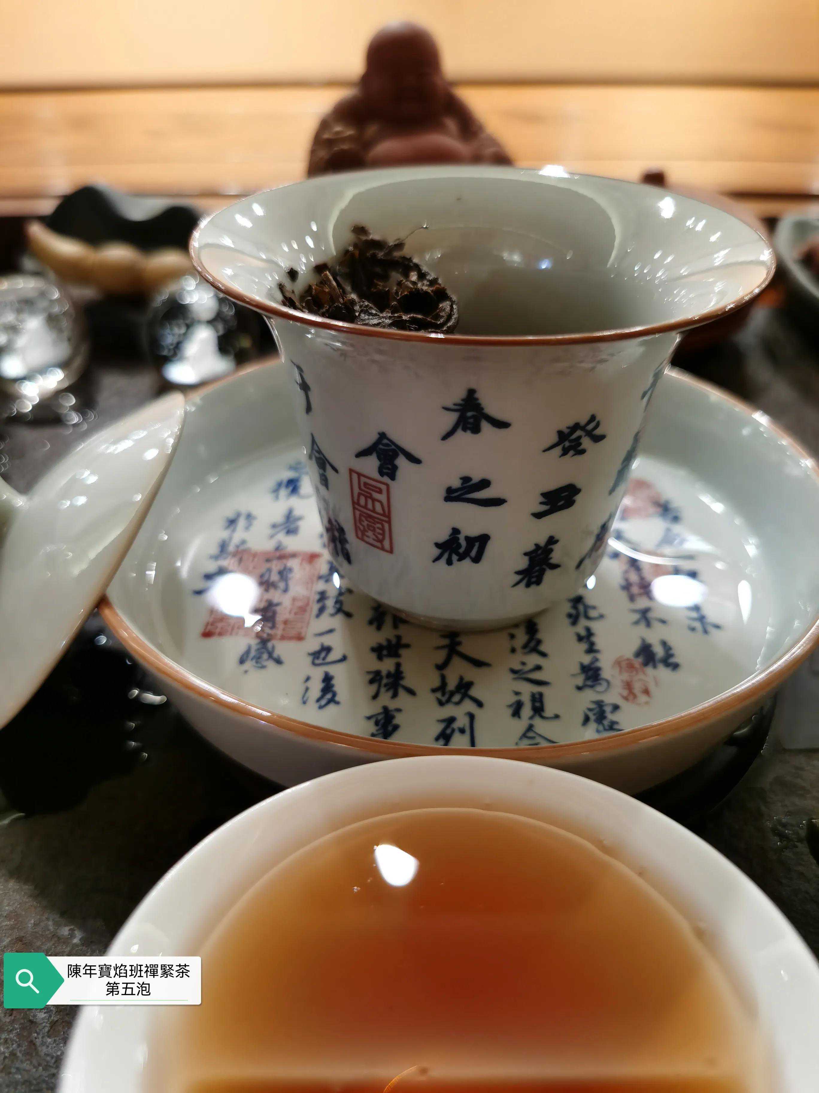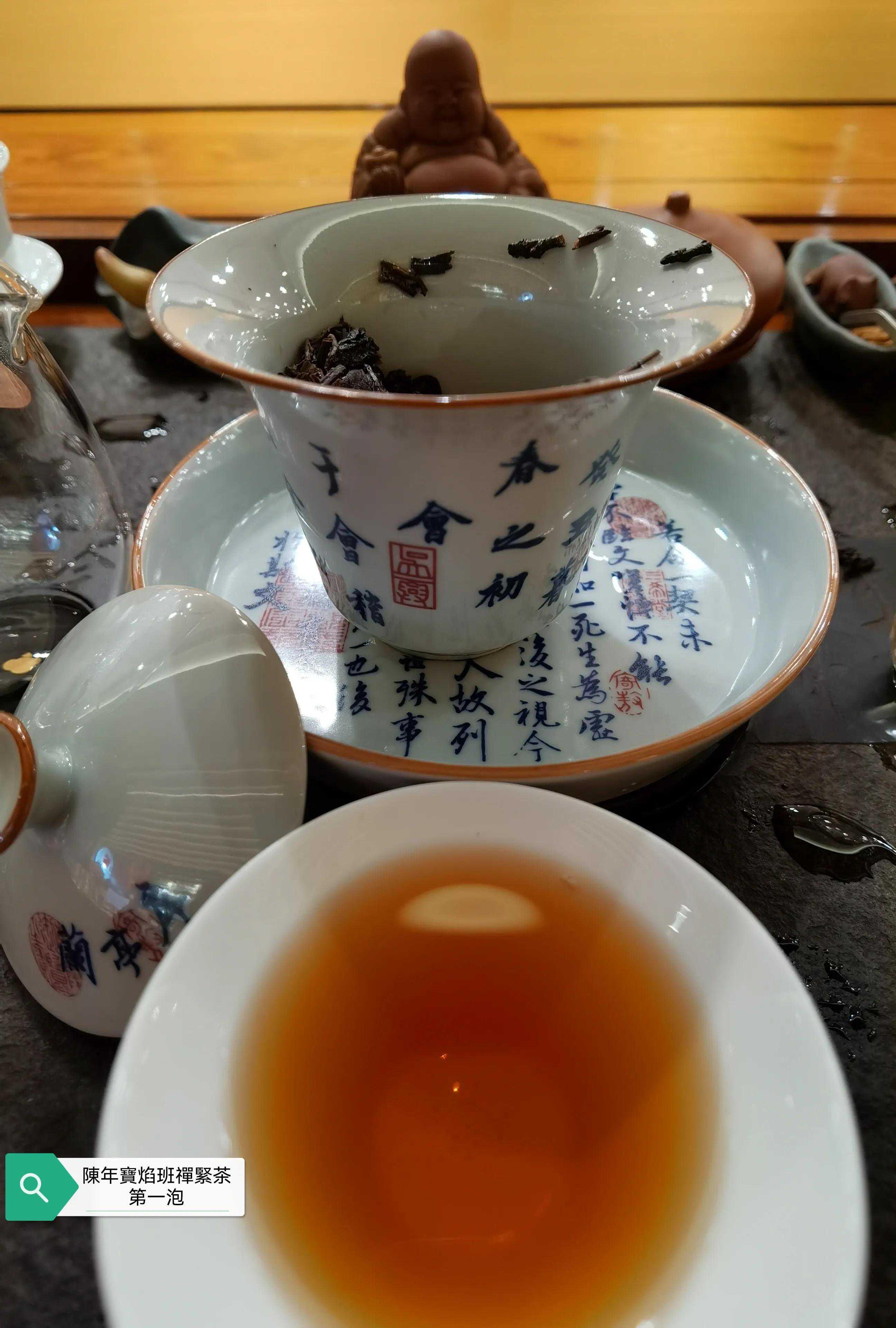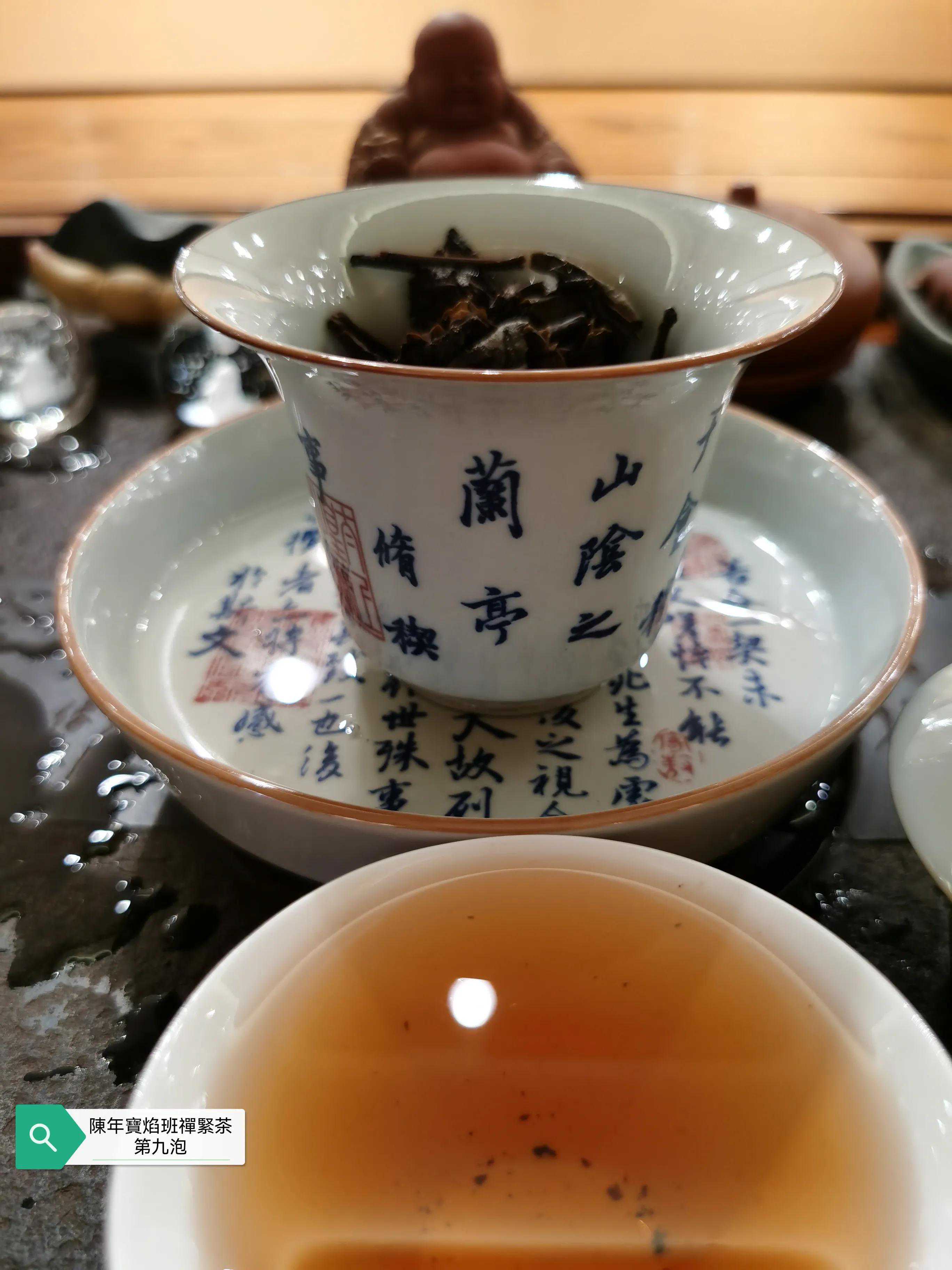 本次品鉴的班禅紧茶具体年份不表以避免营销嫌疑,牛心沱的表述形象无比,外观沱型完整,紧茶柄完整,紧茶干茶条索粗壮肥硕大条,茶骨黄片大叶紧压成型,这是下关紧茶的传统工艺特点,多年的仓储转化的原因导致紧茶颜色由新茶的黄绿色转为深褐色,出现松脱毛边现象。投茶量8克,滚水冲泡,冲泡出现的茶香除了下关茶厂特有的高香外,有陈香樟香木香和花蜜香,汤色红润清澈透亮有光泽,近似令人喜悦的法国干邑颜色,汤感厚滑,挂杯持久,生津回甘迅速,茶味依然厚重,九九归一,汤水细腻,水路甜润,头六冲充分体现下关生茶茶气凌厉霸道的风格,口感饱满,汤感厚重,既有生茶痛快淋漓的霸气,又有陈茶该有的优雅甜润温情,茶底叶片肥硕,富有弹性和活力。