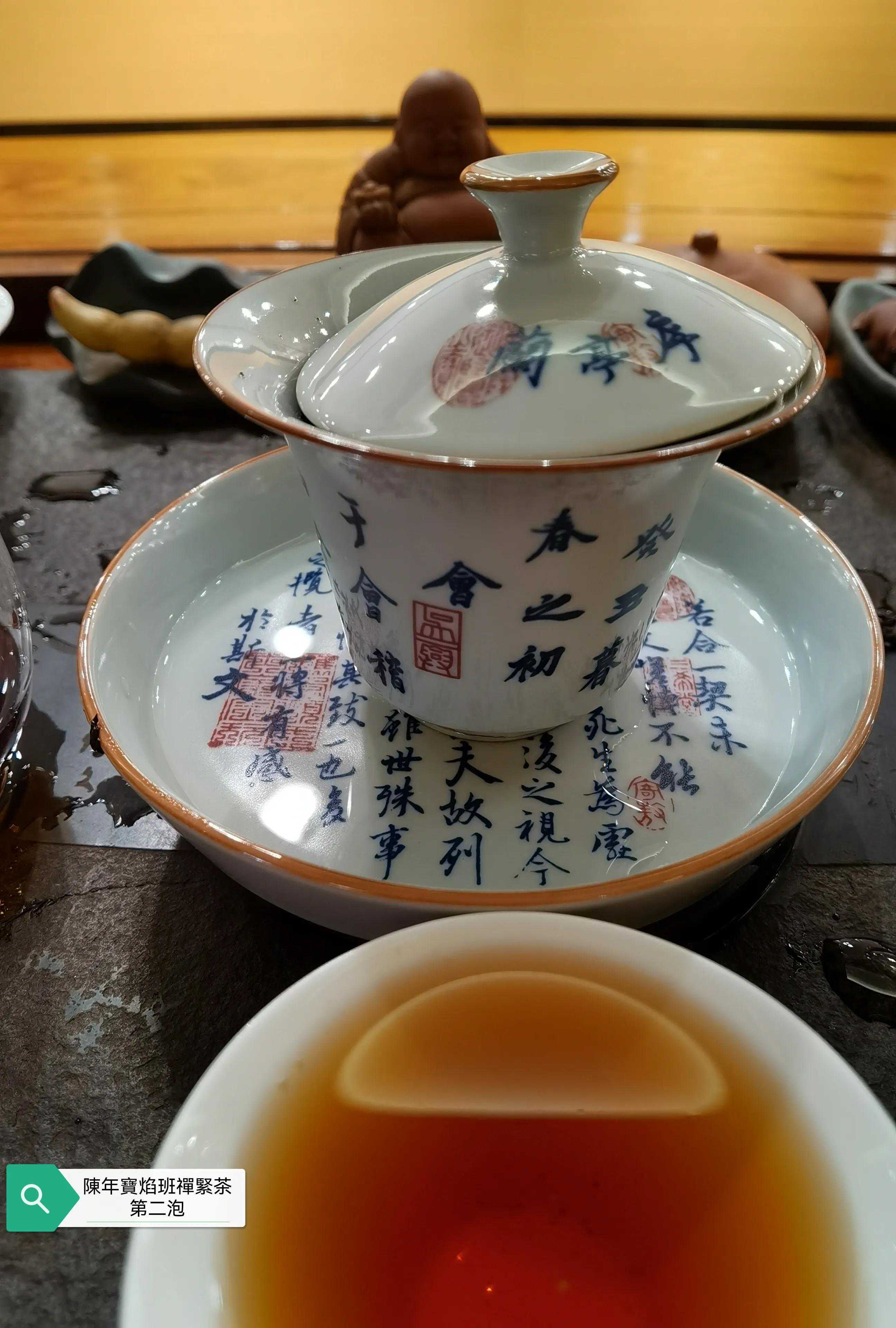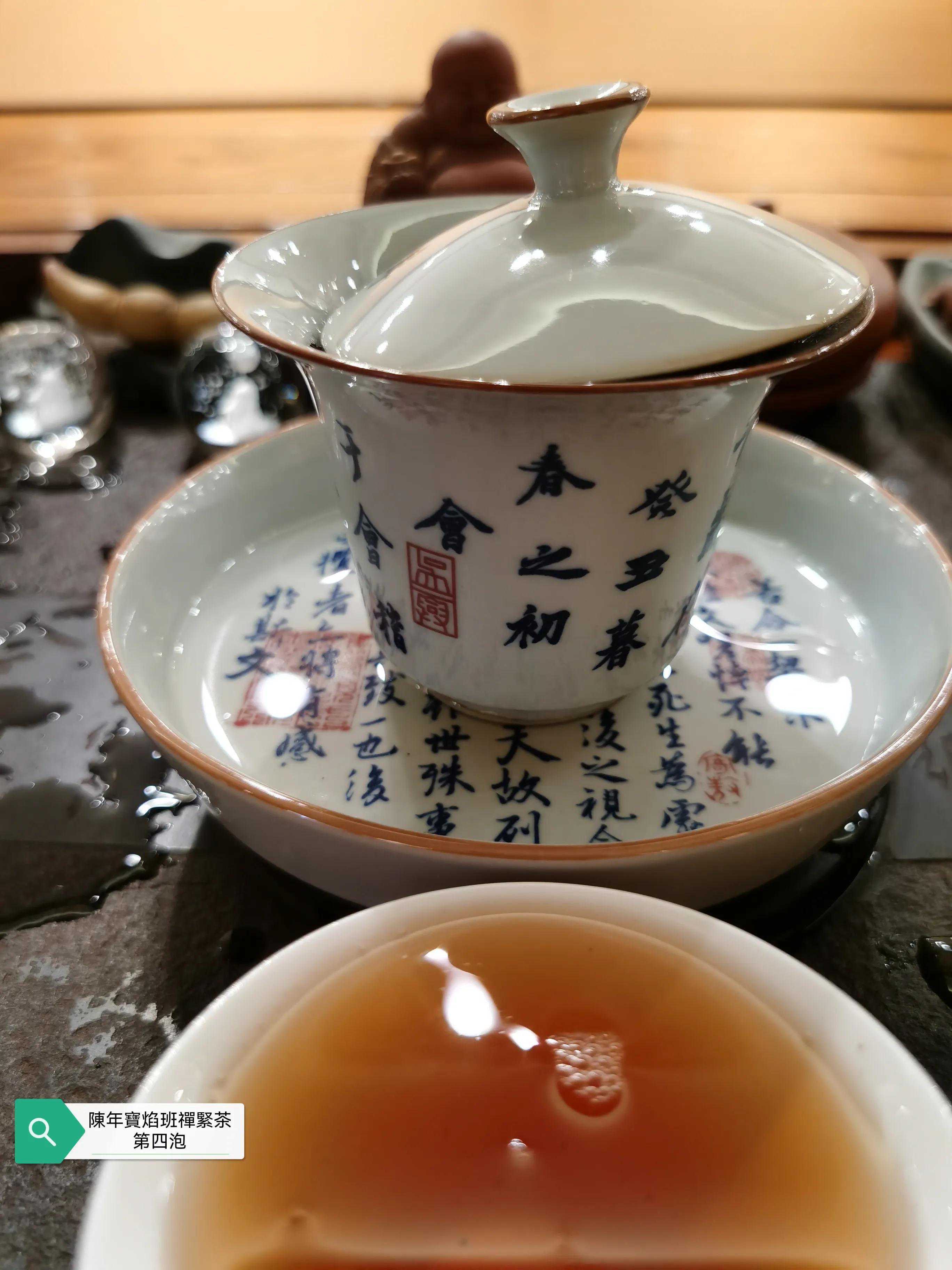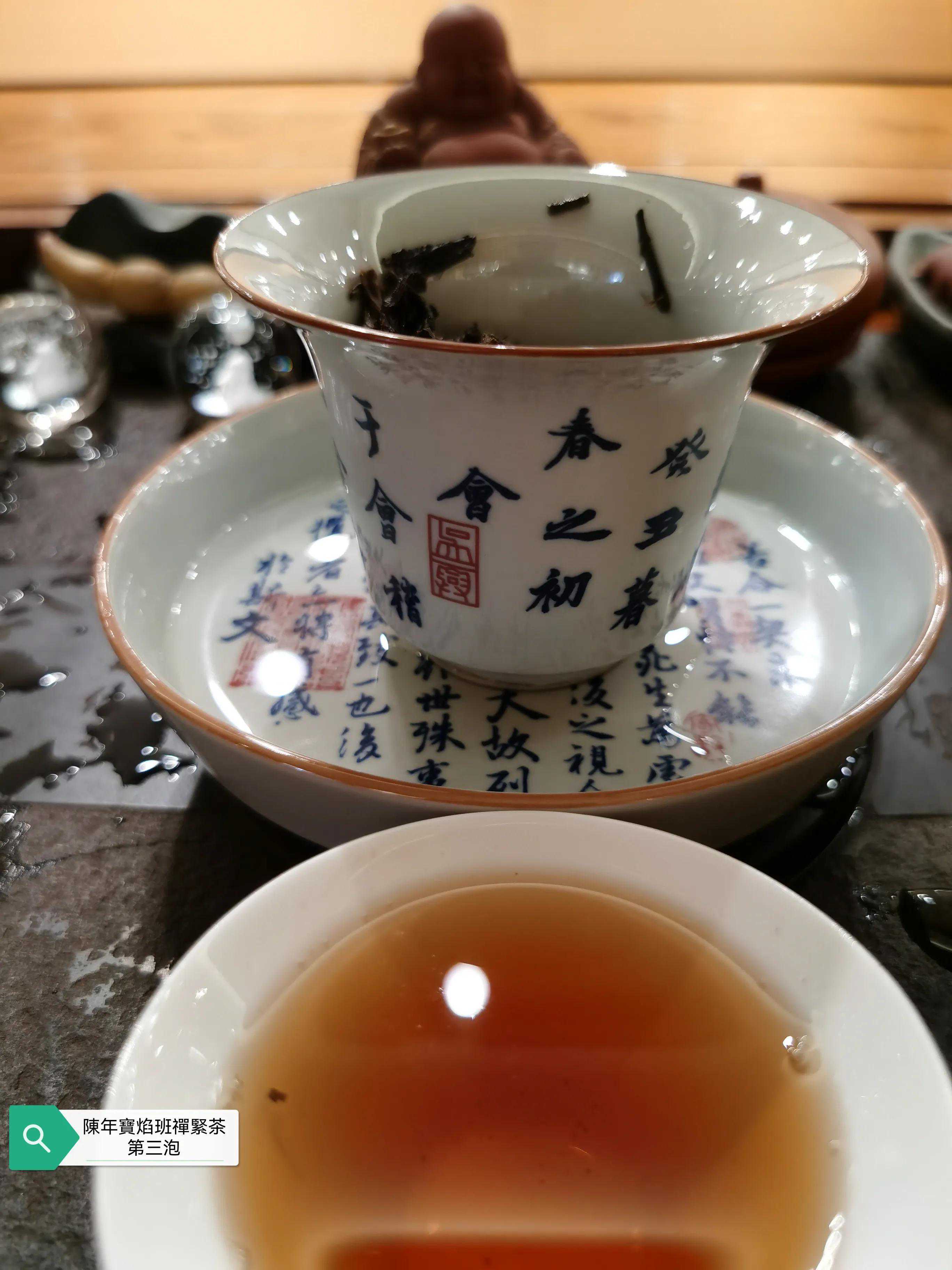 本次品鉴的班禅紧茶具体年份不表以避免营销嫌疑,牛心沱的表述形象无比,外观沱型完整,紧茶柄完整,紧茶干茶条索粗壮肥硕大条,茶骨黄片大叶紧压成型,这是下关紧茶的传统工艺特点,多年的仓储转化的原因导致紧茶颜色由新茶的黄绿色转为深褐色,出现松脱毛边现象。投茶量8克,滚水冲泡,冲泡出现的茶香除了下关茶厂特有的高香外,有陈香樟香木香和花蜜香,汤色红润清澈透亮有光泽,近似令人喜悦的法国干邑颜色,汤感厚滑,挂杯持久,生津回甘迅速,茶味依然厚重,九九归一,汤水细腻,水路甜润,头六冲充分体现下关生茶茶气凌厉霸道的风格,口感饱满,汤感厚重,既有生茶痛快淋漓的霸气,又有陈茶该有的优雅甜润温情,茶底叶片肥硕,富有弹性和活力。